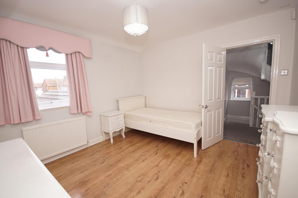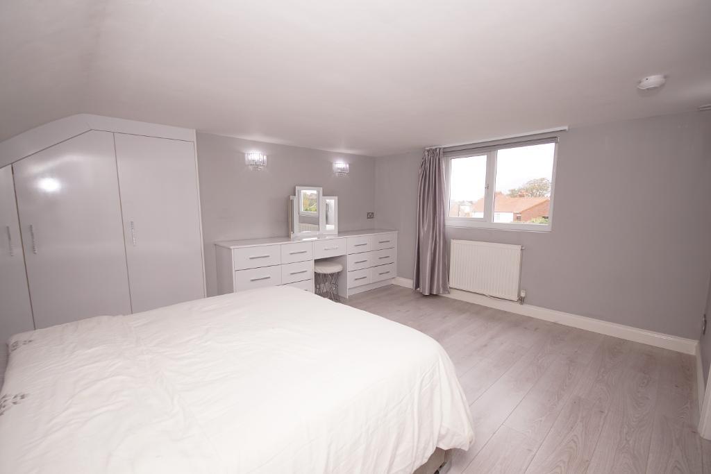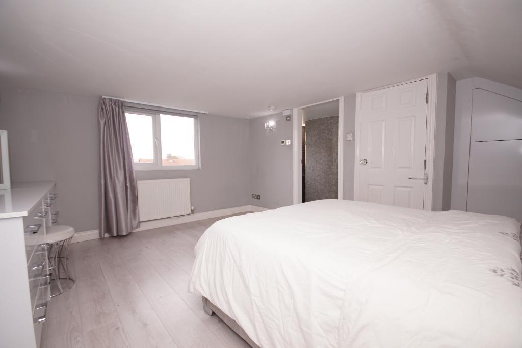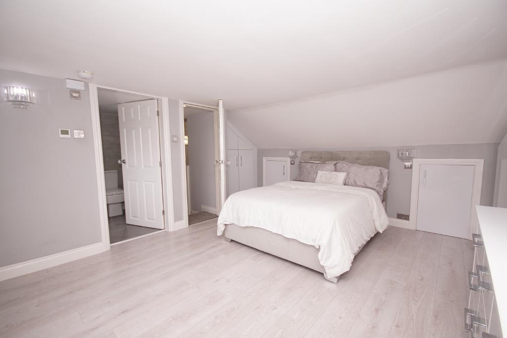 14' 6'' x 14' 6'' (4.45m x 4.42m) (Approx Measurements) Great size second floor master bedroom with UPVC glazed rear window providing unrestricted views to the garden below. Panelled radiator fitted below the window, and a light grey wood effect floor laid throughout. A full range of fitted wardrobes are presented to either side aspect of the bedroom, in addition, there are doors providing access to the under eave storage to the front. A side internal door opens into an en suite shower room.