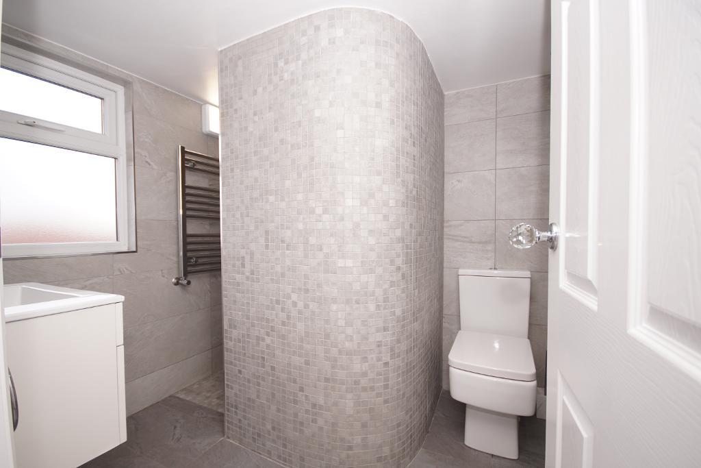 6' 11'' x 6' 2'' (2.13m x 1.9m) A luxury en suite shower room with fully tiled walls and floor, UPVC frost glazed rear window, and wall mounted heated towel rail. The en suite is comprising of a low level dual flush WC, wall mounted wash basin and open tiled walk in shower.