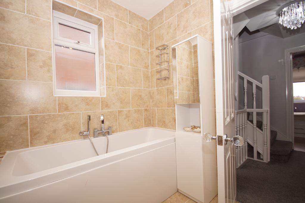 7' 4'' x 6' 6'' (2.26m x 2m) A modern fitted bathroom with travertine tiled walls and floor, UPVC frost glazed side window. The suite is comprising of a wall mounted wash basin, separate corner quadrant shower, low level dual flush WC and panelled bath with shower attachment.