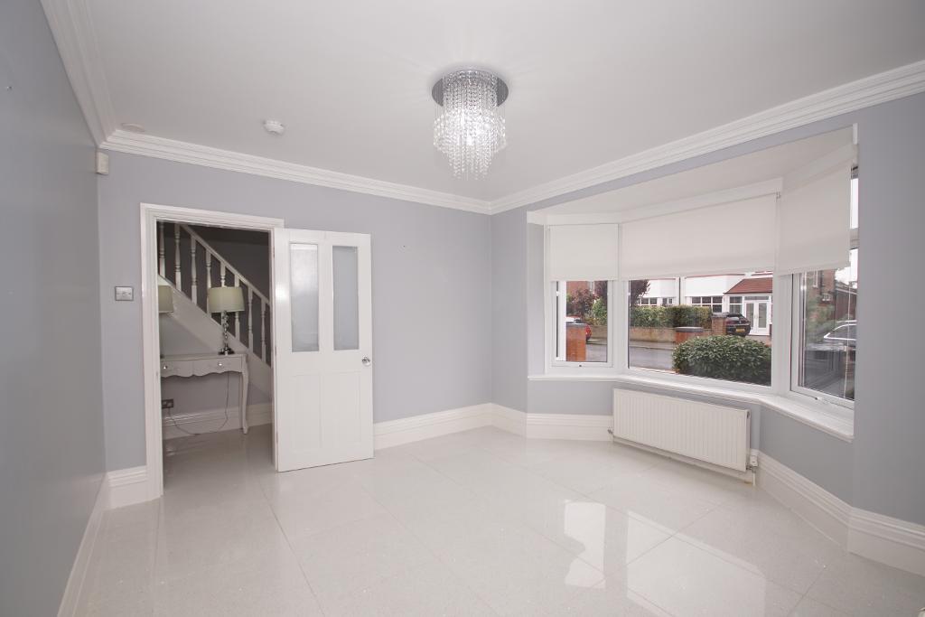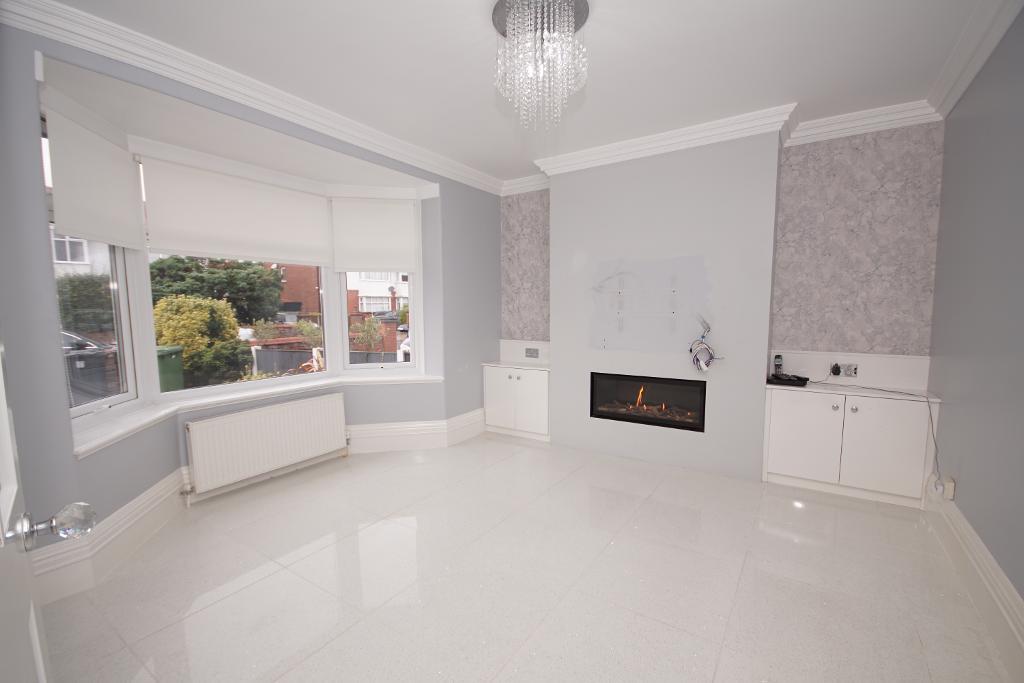 12' 11'' x 12' 9'' (3.95m x 3.91m) A light and bright front reception lounge with a bay to the front aspect housing UPVC glazed window and panelled radiator presented below. Within the side chimney breast is a log effect real flame gas fire with fitted storage closets presented either side. Porcelain tiled floor laid throughout.