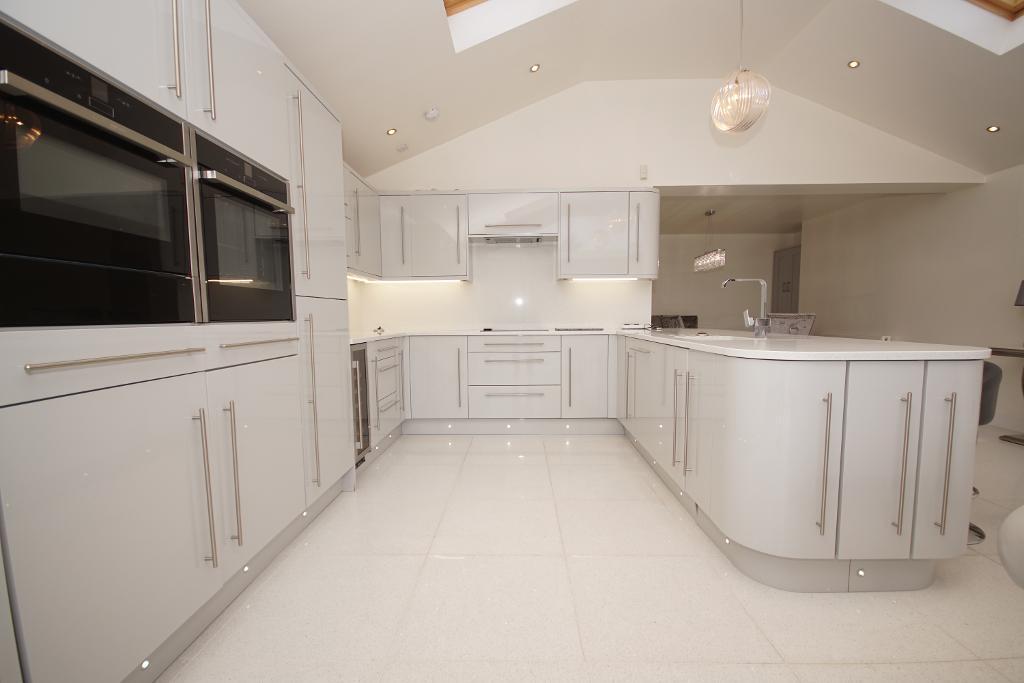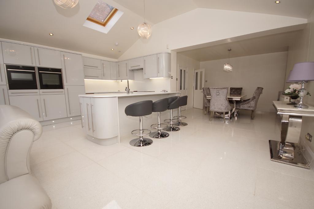 22' 7'' x 19' 8'' (6.9m x 6m) A fabulous and spacious open-plan vaulted ceiling modern fitted kitchen and family room. A full suite of bi-folding doors to the rear aspect provide access out onto the rear garden with Velux windows fitted to the vaulted ceiling along side recessed lighting. A porcelain floor is laid throughout the family room and kitchen and continues through into the breakfast room. Within the kitchen there is a great range of base and eye level storage units and a Quartz worksurface fitted throughout. There is a full selection of integrated appliances including a Neff double oven and hob, an extractor fan, full height separate fridge and freezer, under counter wine cooler and dishwasher.
