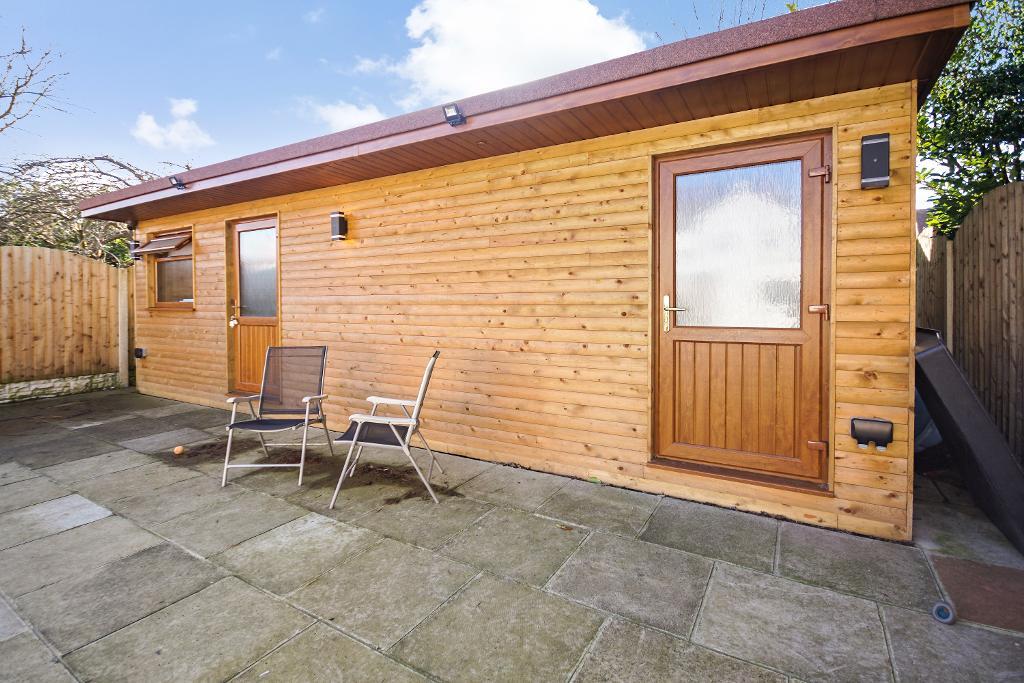 Extensive majority flagged and paved rear garden with a section of artificial grass laid to lawn. Raised decked terrace to the immediate rear of the conservatory. Garden is separated by a wooded framed and trellis fencing with the rear aspect housing an impressive large wooden framed cabin/lodge that is presently utilised as kennels for our clients dogs.
