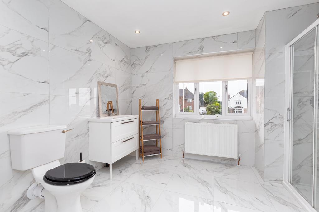 10' 6'' x 11' 5'' (3.22m x 3.48m) A recently renovated and new en suite shower room to the master bedroom. uPVC glazed front window, panelled radiator and recessed lighting to the ceiling. The new suite is comprising of a double shower, washbasin over a vanity storage unit and a low-level flush WC. The bathroom has been impressively tiled throughout.
