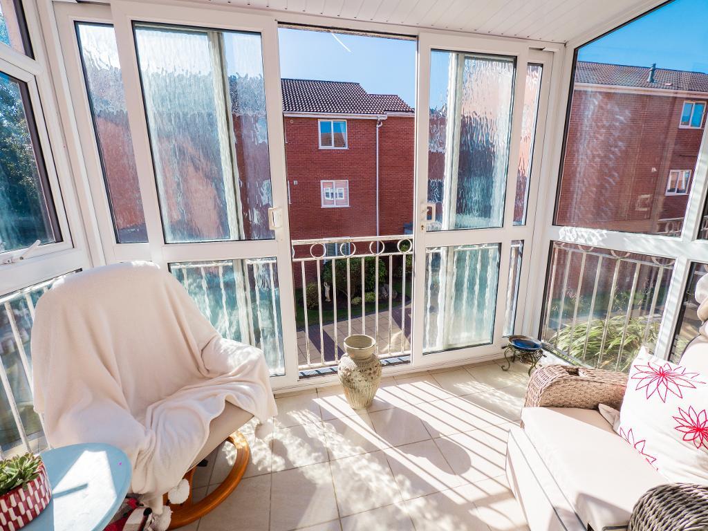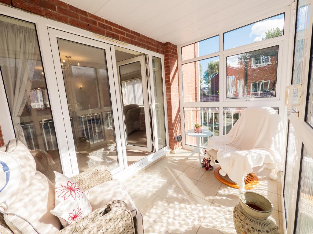 Inside the apartment, you"ll find a welcoming central hallway, complete with a convenient cloak cupboard and stylish "Karndean" flooring. The generously proportioned reception lounge is bright and airy, with double patio doors opening onto an enclosed uPVC-glazed balcony. This fantastic space allows you to enjoy outdoor views year-round, no matter the weather.