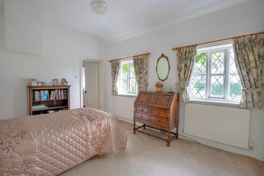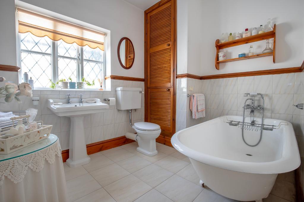 The property boasts three generously sized double bedrooms, with one offering the added luxury of an en-suite bathroom, complete with a bath, WC, and vanity unit sink. The main bathroom is equally impressive, featuring a pedestal sink, WC, and a striking freestanding roll top bath with mixer tap and hand held shower. Both the bedroom and living areas are enhanced by windows with elegant lead beading detail, adding to the cottage's character and charm.