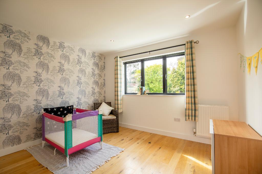 Five generously sized double bedrooms provide exceptional comfort,with four of the five bedrooms enjoying rear-facing views over the magnificent landscaped garden.Two of these benefit from sleek en-suite shower rooms, while the principal suite boasts bespoke fitted wardrobes,a private dressing room, and patio doors that open onto the garden.The stylish family bathroom is fitted with Grohe fixtures,including a contemporary vanity unit,WC,bath with overhead rainfall shower, and a glass screen.