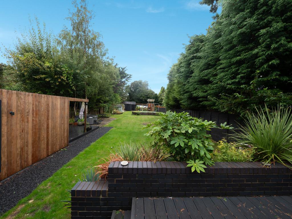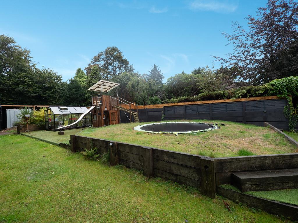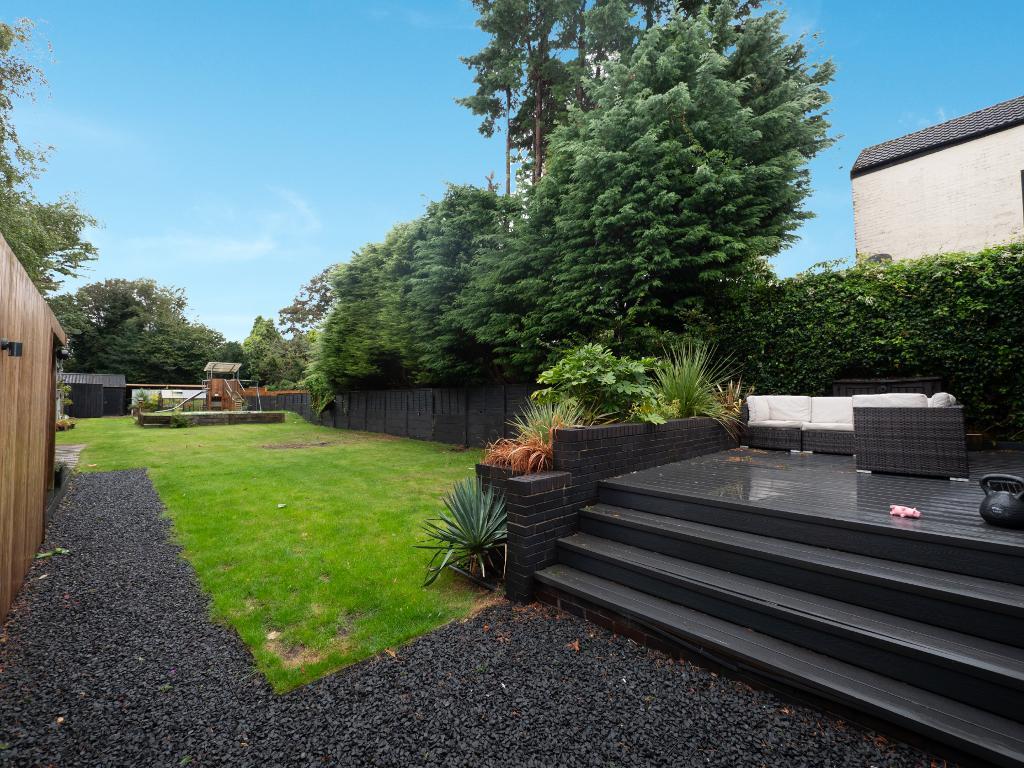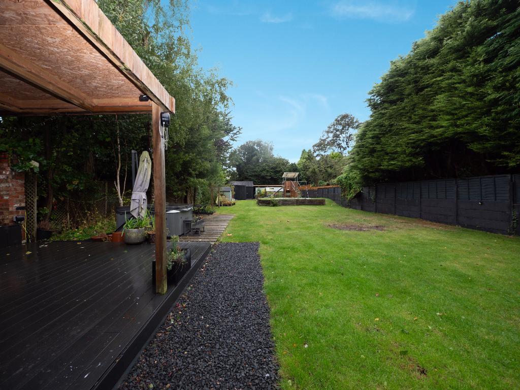 The rear garden is a true highlight, boasting a large lawned area and a decked patio that extends directly from the kitchen/dining space, perfect for outdoor dining and relaxation. To the left, an outbuilding provides additional seating and storage options. Further along, you will find more outbuildings, a greenhouse, and even a children's climbing frame, making the garden both practical and family-friendly. To the front, a spacious driveway provides ample parking for multiple vehicles.