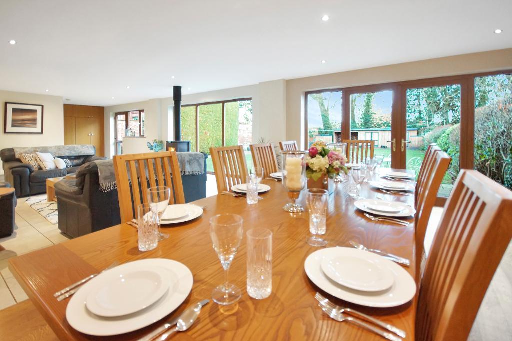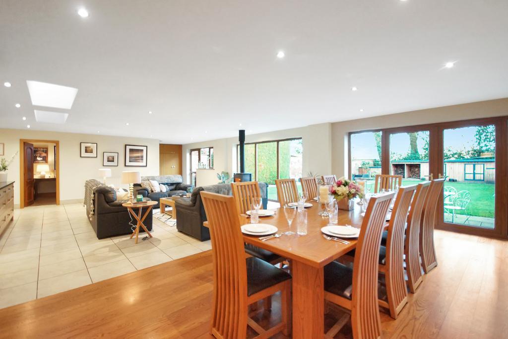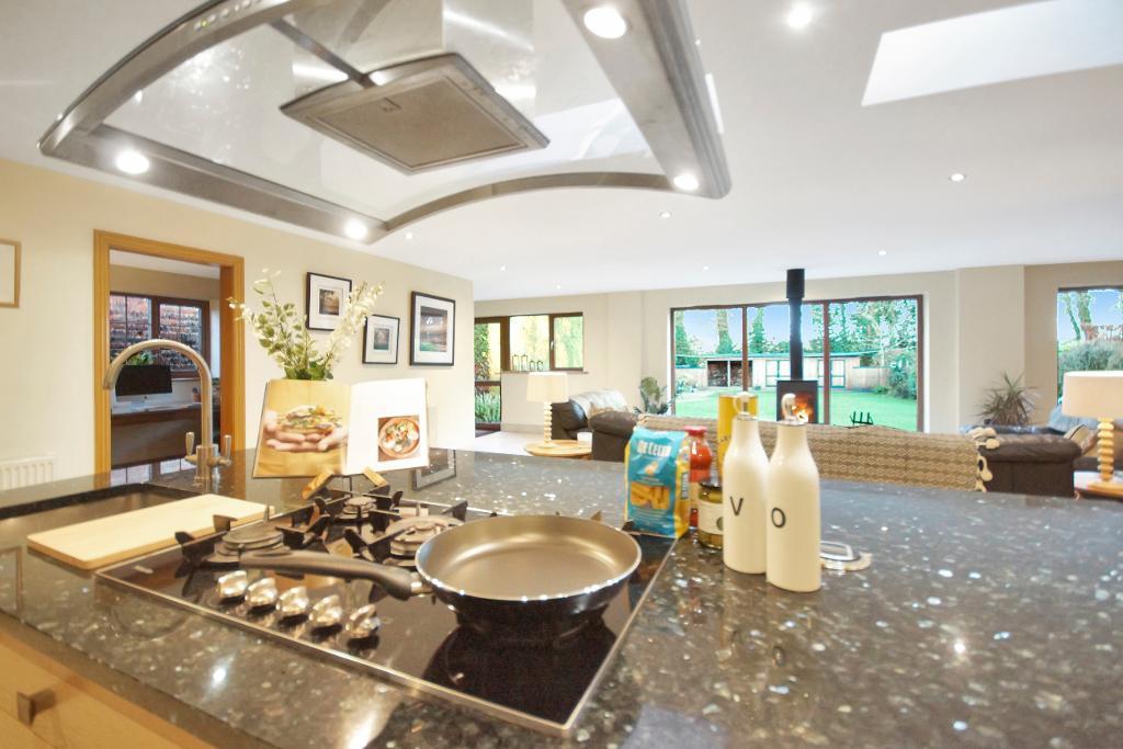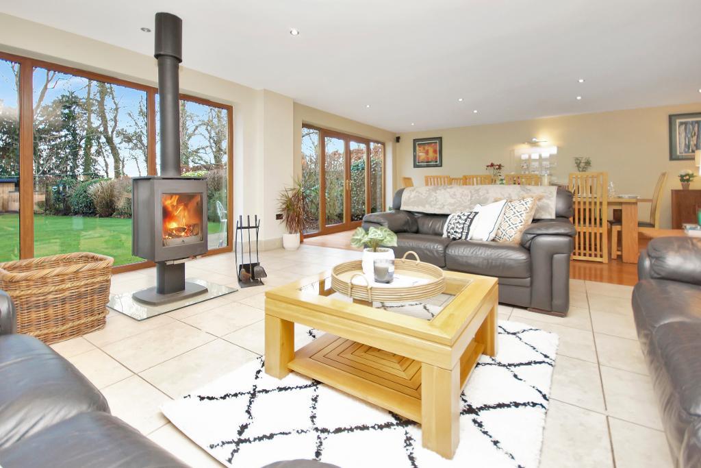The heart of the home is the open-plan kitchen, living, and dining area. The beautifully finished kitchen features a large central island, while the adjoining living area, complete with a log burner, creates a cosy yet stylish setting. The spacious dining area is ideal for hosting and entertaining. To the left of the kitchen, a practical utility room provides access to the spacious garage, and just beyond, a good-sized office adds further versatility to the ground floor.
