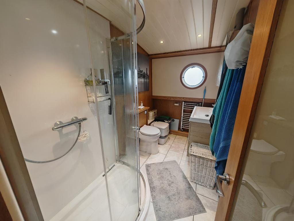 Step inside and you are greeted by a true home from home. The spacious, open-plan kitchen, dining, and lounge area creates a warm and inviting living space, complete with a fully equipped kitchen for modern convenience. The lounge is centred around a cosy multi-fuel stove, ideal for curling up on winter evenings as the water laps gently outside. Two good-sized bedrooms provide comfortable accommodation for up to four people, and a stylish, modern shower room completes the interior, making life on board both practical and enjoyable.