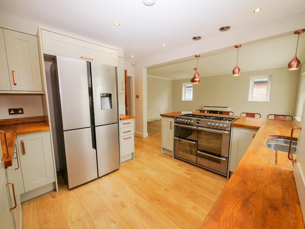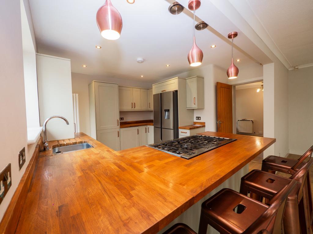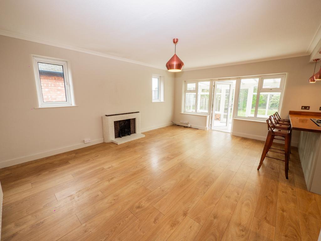 At the heart of the home is the open-plan kitchen and living area, a stunning, tastefully designed space that"s both functional and inviting. The modern kitchen includes ample counter space and a central island, while the living room boasts wooden flooring, a feature fireplace, and plenty of room for entertaining or cosy nights in. Flowing seamlessly from here, the bright and airy conservatory opens directly onto the rear garden.
