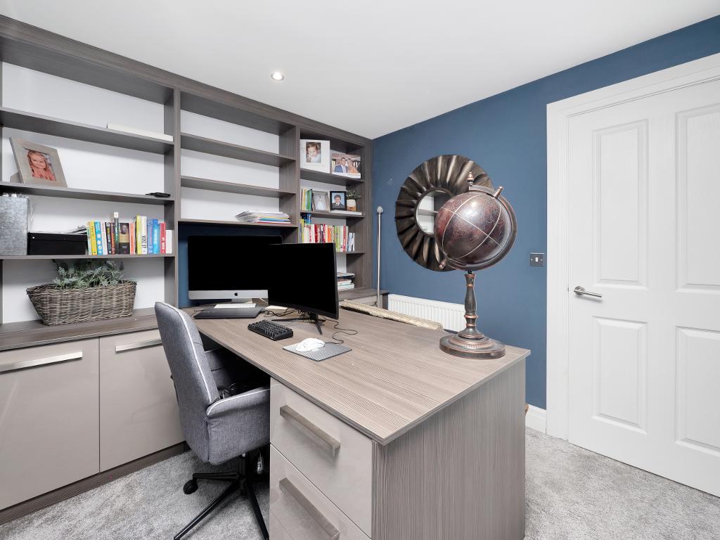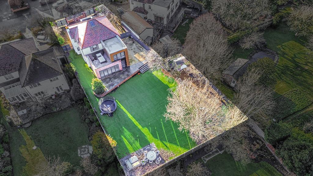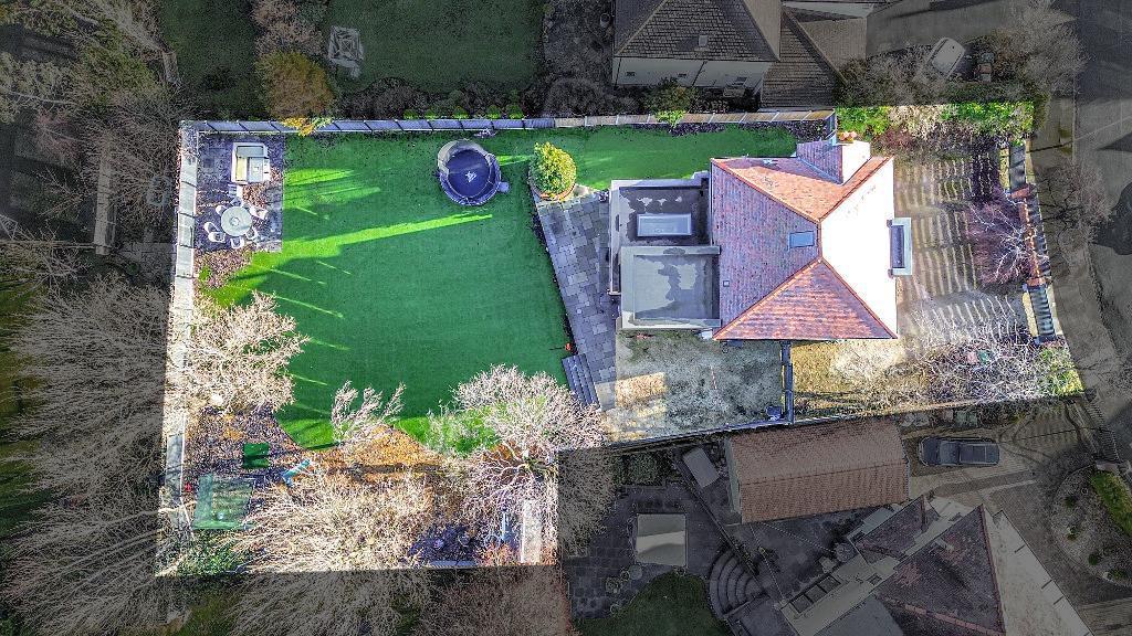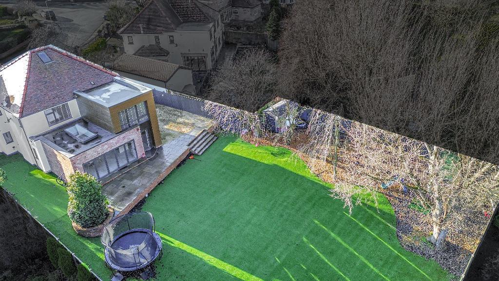 Externally, the rear garden is a true showstopper. Wrapping around both sides of the property, it has been designed for low maintenance and maximum enjoyment. A large astroturf lawn provides a perfect space for children and entertaining, while mature trees to the left offer privacy and a peaceful backdrop. The left side of the house features a gravelled area with side access to the front. To the rear right, there is a dedicated seating area, ideal for outdoor dining during warmer months, while the right side of the garden boasts a creative astroturf putting green, adding a unique and fun feature to this exceptional outdoor space.