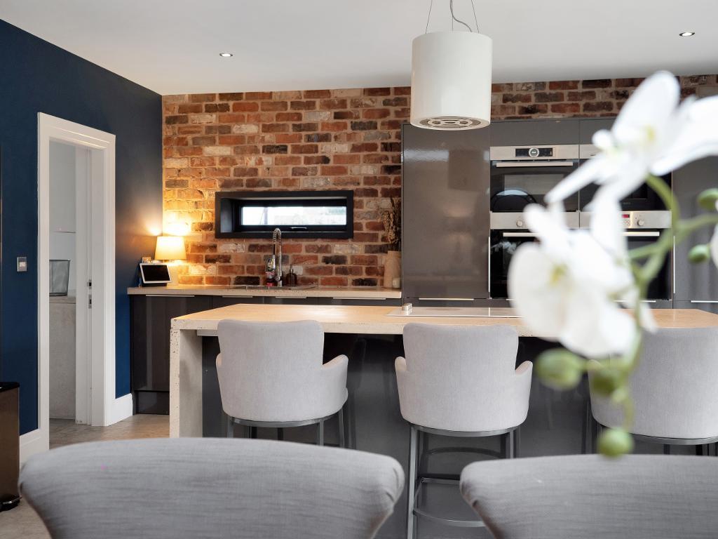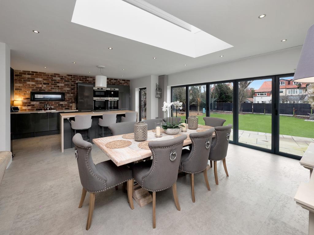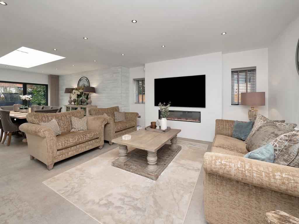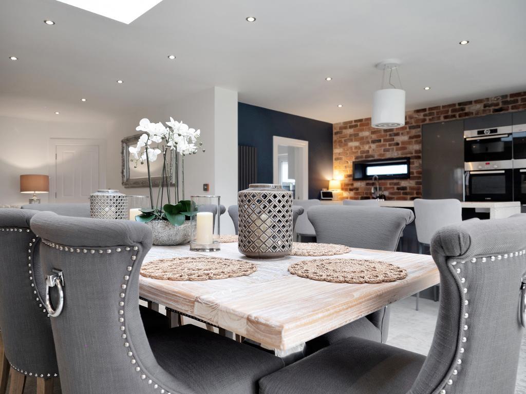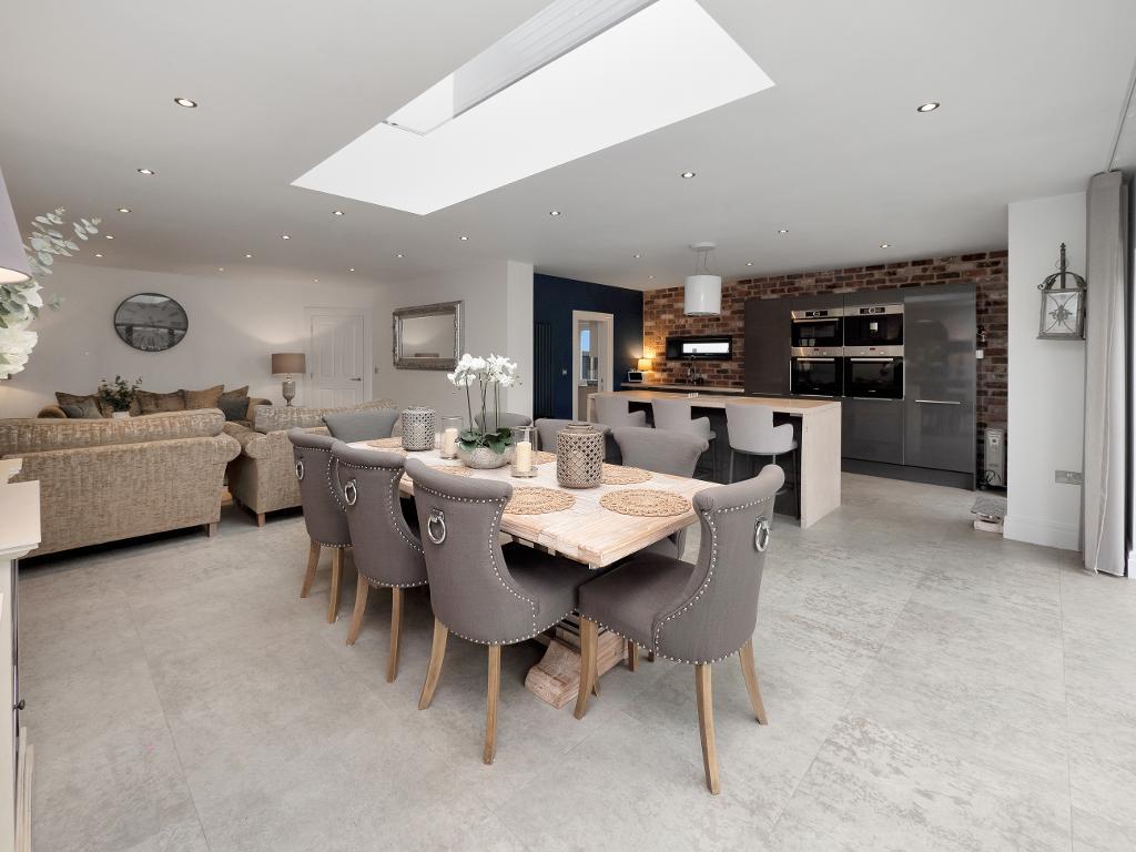 Returning to the hallway and continuing through the home, you are welcomed into the heart of the house, the impressive open-plan lounge, dining area and kitchen. While open in design, each area has been carefully defined to create distinctive, functional spaces. The lounge area retains a warm and cosy feel, ideal for family living, while the dining area is bright and spacious, enjoying stunning views of the garden through bifold doors that seamlessly connect indoor and outdoor living. The kitchen is finished to an excellent standard, featuring a large central island that provides ample workspace and storage. To the rear of the kitchen is a convenient utility room, adding to the practicality of the home.