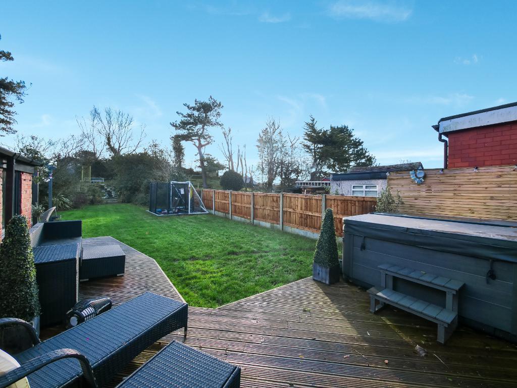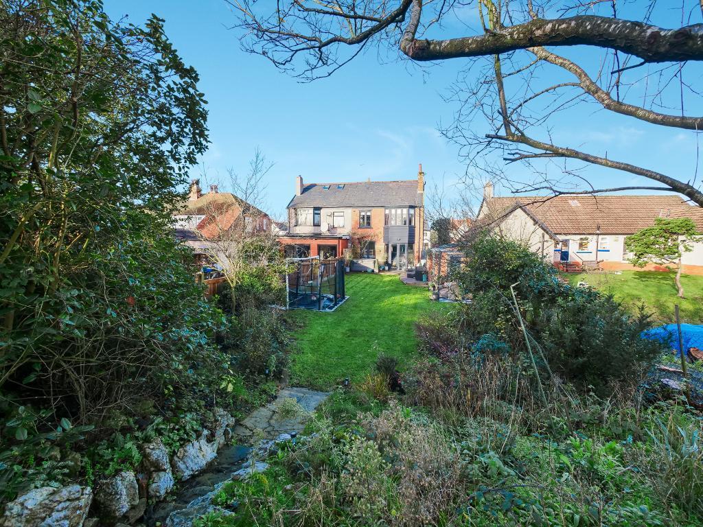 The garden is another impressive highlight. With a combination of decking and a large lawned area, it provides ample space for children to play and adults to relax. At the back of the garden, a raised area surrounded by mature trees and foliage adds character and privacy, complete with a handy shed and an elevated view over the lower garden.