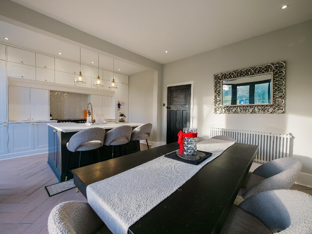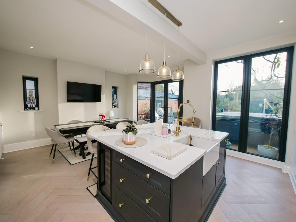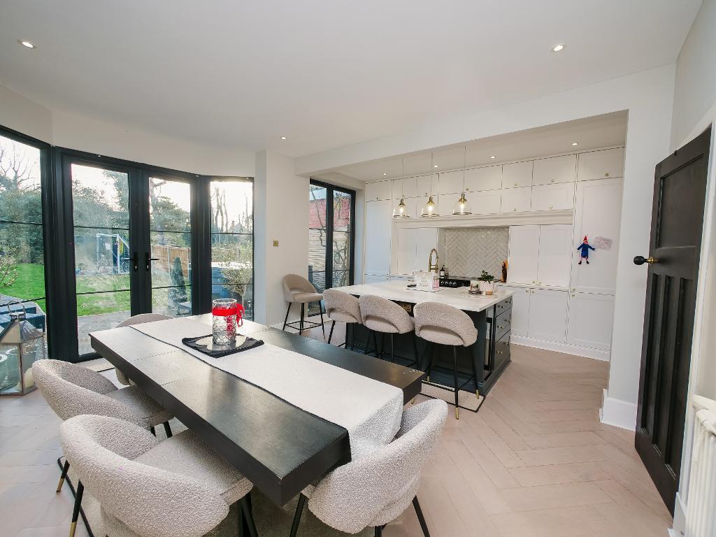 Back through the hallway and across, you"ll find the stunning open-plan kitchen and dining room, one of the standout features of the home. The kitchen boasts tasteful finishes, a beautiful central island, and striking floor to ceiling black framed windows that create a modern and elegant feel. The dining area offers plenty of space for a good sized dining table, and the black framed doors open directly onto the garden, perfect for family gatherings and entertaining.
