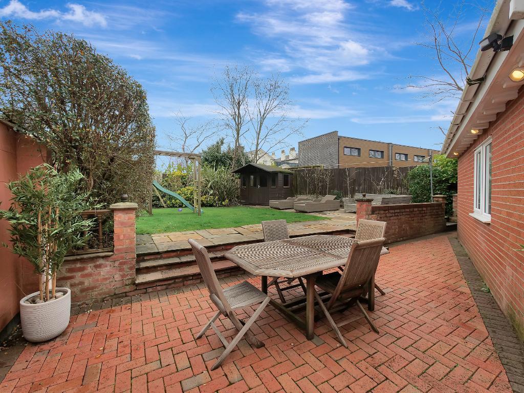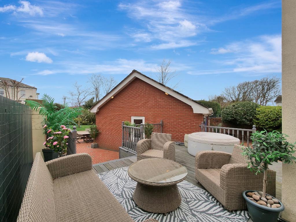 Externally, the property continues to impress. Double doors from both the kitchen and office open onto a decking area, creating the perfect outdoor seating space for relaxing or entertaining. Just outside the kitchen doors are stairs leading down to the cellar, which provides three good sized storage rooms. Steps also lead down towards the rear of the garden where you will find a raised lawn area along with a paved section, offering another excellent spot for outdoor seating.