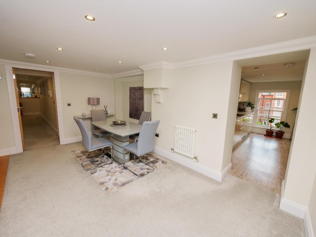 As you move through the property, the hallway leads into an elegant split level dining area, which seamlessly steps down into an impressive reception lounge. This striking living space is enhanced by south facing sash windows that flood the room with natural light while offering delightful views across the promenade and Marine Lake.